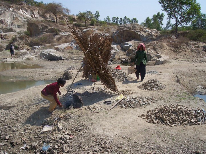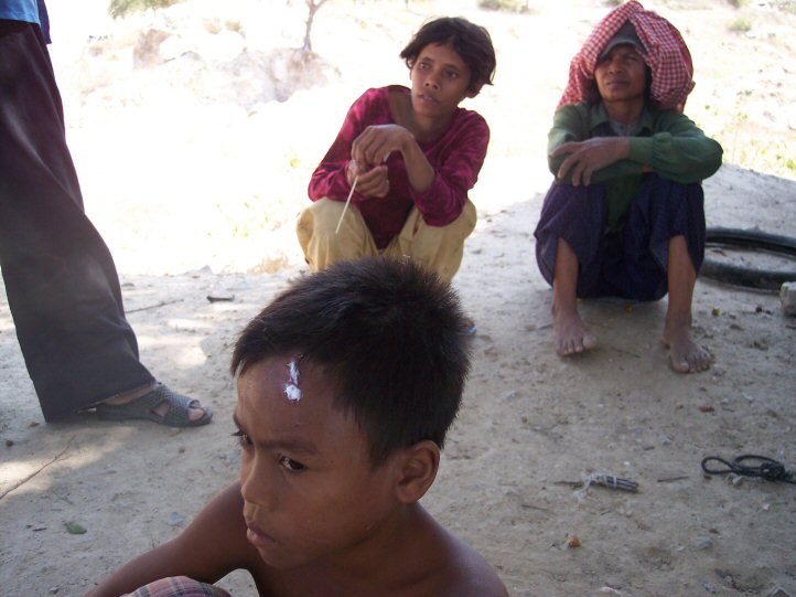 Nous a conduit dans les carrières. Nous y avons trouvé des enfants avec des plaies profondes et infectées, occasionnées par les éclats des pierres qu’ils cassent. Il nous a fallu nettoyer et panser ces blessures.A propos des lunettes de protection que nous leur avions offertes, leur destination première qui était de protéger leurs yeux des éclats de pierres, a été détournée et profitent au paysans qui ainsi se protégent des poussières lors du battage du riz.