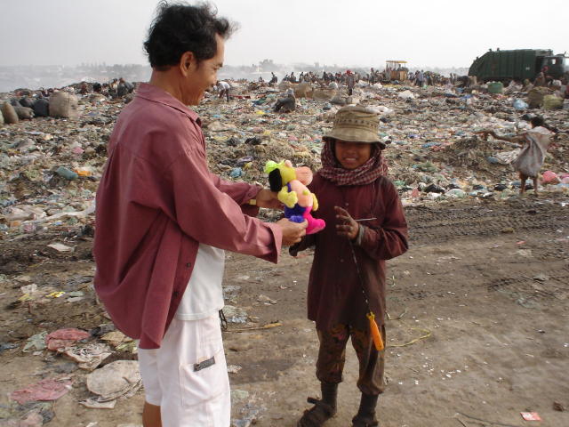 Cette année, en plus de l’aide en faveur des camps de réfugiés et de ses actions dans la région de Phnom Phen, l’association AME D’ASIE a apporté un secours financier aux sinistrés du tsunami de l’île de Koh Pee Pee. Compte rendu des opérations menées dans la région de Phnom Penh. La première opération s’est située dans la décharge nous a permis de nous rendre compte de la misère de cette population.Des familles entières issues des campagnes cherchent dans cette décharge à ciel ouvert et dans une odeur pestilentielle, un moyen de subsistance.Pour un ½ dollar par jour, ils travaillent nuit et jour dans ce marécage d’ordures en putréfaction.Nombreux sont ceux qui n’en sortiront jamais.Souvent atteints de maladies graves, ils n’ont pas les moyens de se soigner ni même d’arrêter le travail pour aller consulter un médecin.A l’exemple de cette fillette de 4 ans, déshydratée par une diarrhée, que nous avons trouvée entourée de mouches et qui, sans notre secours immédiat, ne serait plus de ce monde.La mère interrogée sur cette inaction de sa part, nous a expliqué qu’elle ne pouvait pas se permettre de cesser le travail pour consulter un médecin sans mettre en danger la vie de ses autres enfants.Nombreux sont également les enfants qui se font écraser par les pelles mécaniques ou les camions. Les parents reçoivent alors 50$ de dédommagement.Pour soulager cette détresse, en plus d’une soupe 2 fois par semaine, nos faibles moyens ne pouvant nous permettre plus, nous avons distribué quelques jouets et soigné quelques vilaines plaies.
